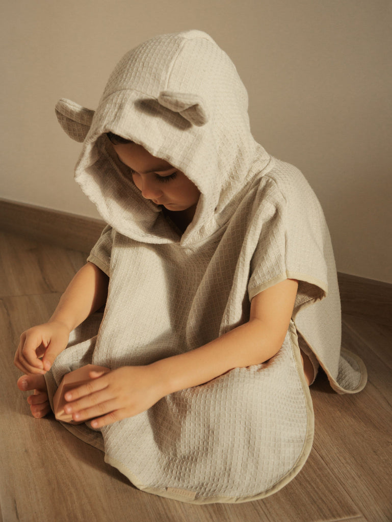 Realizzato con tessuti di origine naturale, combina la praticità della spugna assorbente alla piacevole texture del waffle, perfetta per facilitare l’asciugatura. Il cappuccio con orecchie aggiunge un dettaglio giocoso, mentre il taglio ampio lo rende comodo da indossare anche sui vestiti.